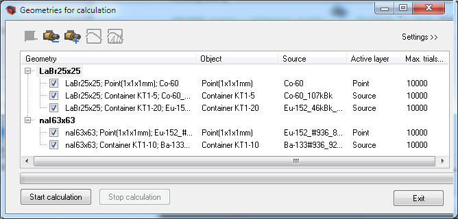 Parameters of detectors and collimators models are specified with easy-to-use GUI and stored in the database. Batch calculation The detection efficiency can be calculated for the list of configurations in batch mode.